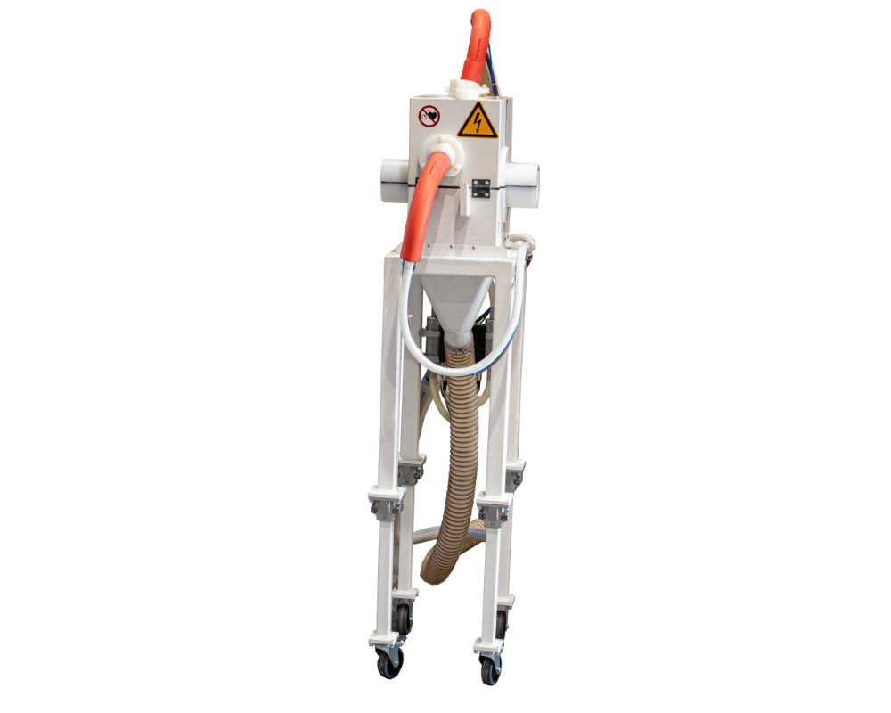 Zusatz-Puderreservoirs mit automatischer Befüllung der Maschine, 90 l Zusatz-Volumen, max. 3 m Abstand zur Maschine möglich. Steuerung über Füllstandssensor der Maschine. Der Wagen eignet sich auch zur trockenen Aufbewahrung des Puders.
